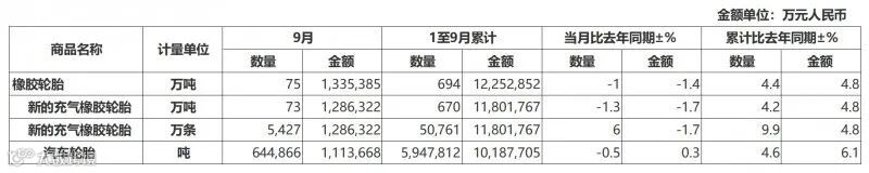 1-9月汽车轮胎出口量为595万吨,同比增长4.6%;出口金额为1019亿元,同比增长6.1%。