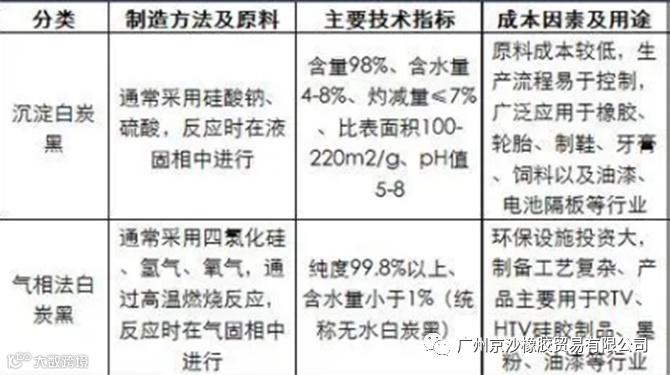比较明显的区别是颜色不同,白炭黑为白色,可以用来制造各种色彩制品和透明制品;而炭黑只能用来制作灰色和黑色制品。
