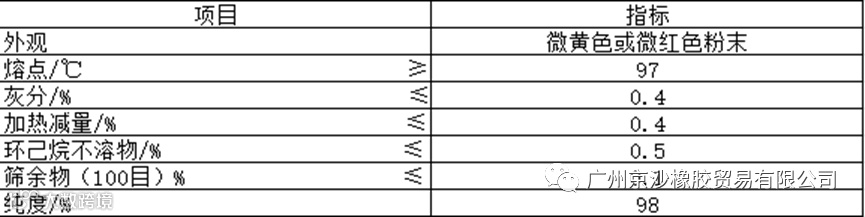主要特征:相对密度1.2,熔点不低于90℃。易溶于苯、二氯甲烷、四氯化碳,溶于汽油、乙酸乙酯、乙醇,不溶于水。