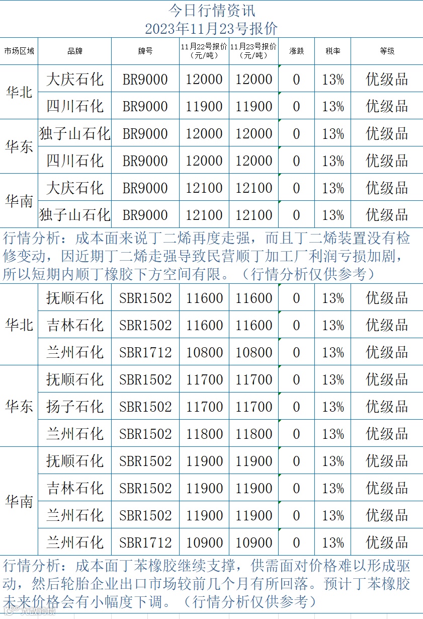2023年11月22号合成橡胶行情资讯
