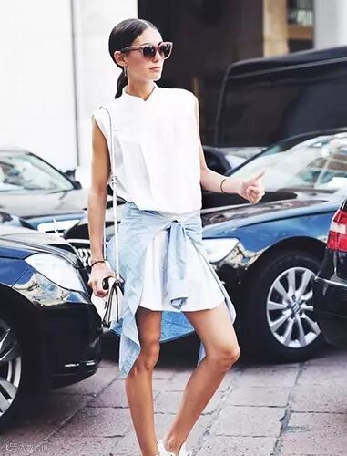 如果一时间找不到合适的女装腰带作为搭配风格,那么就选择一件相近的衬衫系在腰间,假装是腰带搭配风格。