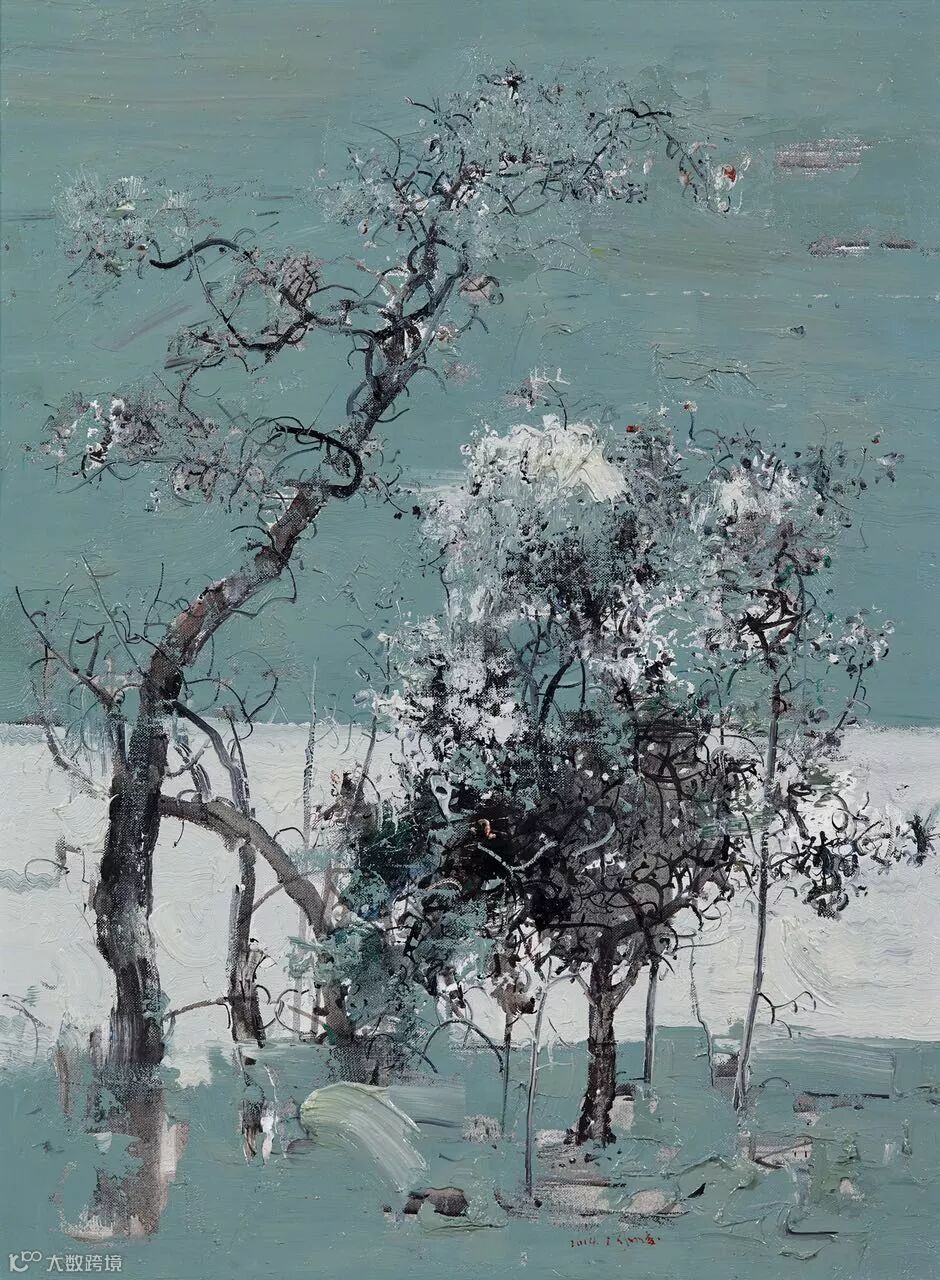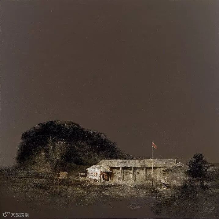 在他的一些画作中——比如入选“庆祝中华人民共和国成立六十周年广东省美术作品展”的《残冬》、入选“2010•中国百家金陵油画展”的《援边生活》,以及入围“百年风云广东近当代重大历史题材美术作品创作工程”的《中山纪念堂》,我们常常能看到大面积的灰调,画面里有黑色的树、有灰色的天,墨象是油画作品中的底色,画面由较为暗沉的色调构成。在这一系列的画作中,我们读到的是艺术家内心世界的深沉、丰富和含蓄。