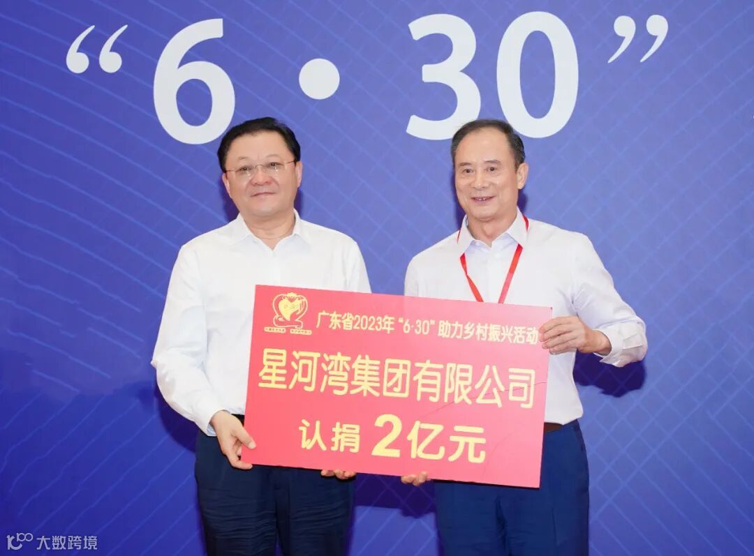 7月4日,以“巩固脱贫成果,助力乡村振兴”为主题的广东省2023年“6·30”助力乡村振兴活动在广州举行。星河湾集团董事长黄文仔先生出席活动,代表集团举牌认捐2亿元,并作为爱心企业代表发言。