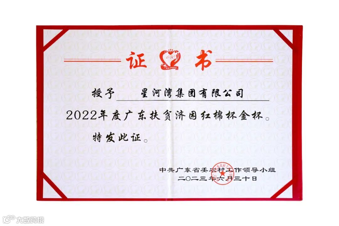 会议宣读了2022 年度广东扶贫济困红棉杯认定结果和“千企帮千镇、万企兴万村”行动“十大”典型评选活动结果的通报,并为 2022 年度广东扶贫济困红棉杯金杯获得者颁发奖杯。星河湾荣获2022年度广东扶贫济困红棉杯金杯奖。