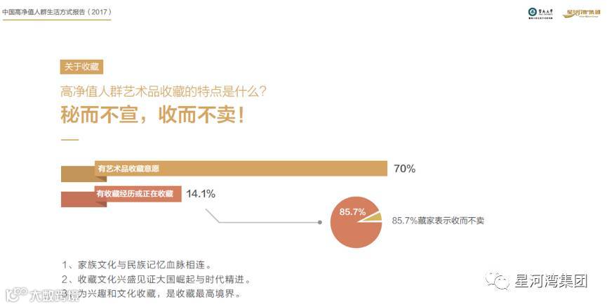 消费升级时代,整个中国社会的消费结构、消费观念、生活理念、审美观念都在逐步升级。作为推动中国经济发展的重要角色和消费升级的重要组成部分,走在时代前列的高净值人群,已经从物质致富迈向了精神致富。古董、书画、当代艺术品屡屡在拍卖行被人以高价收藏,就是重要的佐证。藏而不卖,收而不卖,是高净值人群对于古董和艺术品秘而不宣的特点。