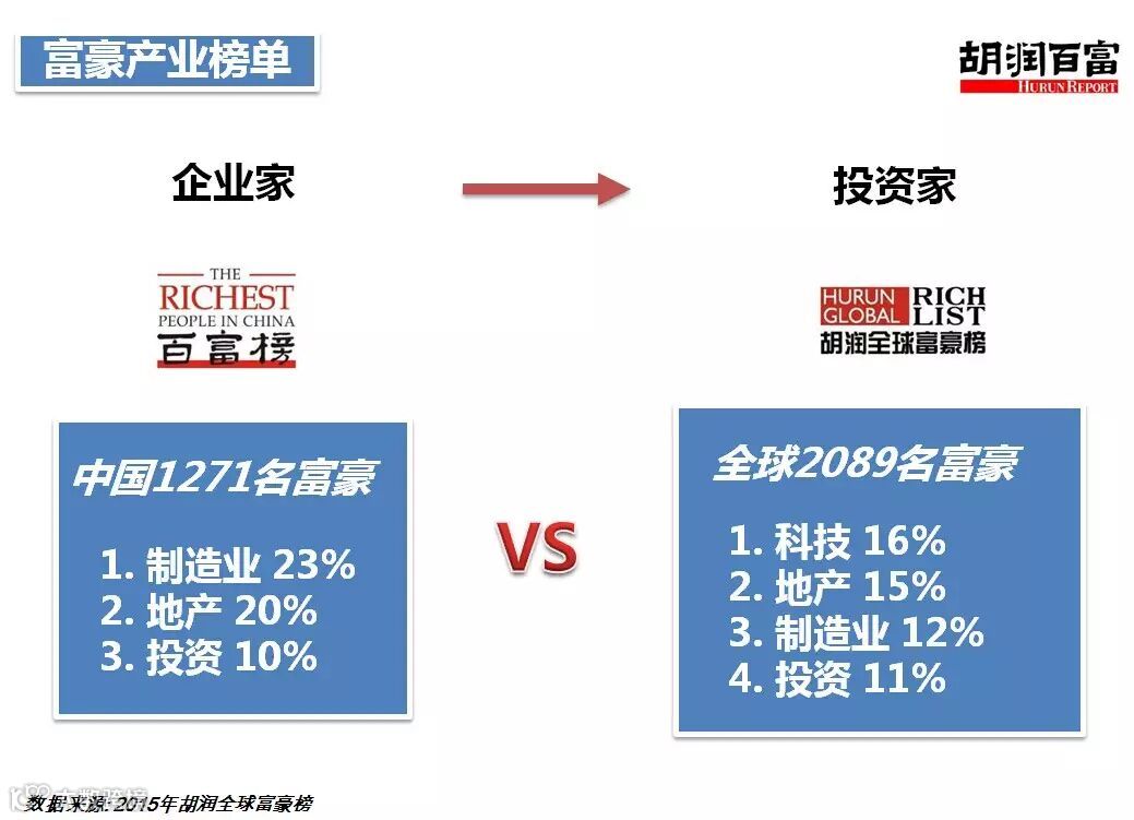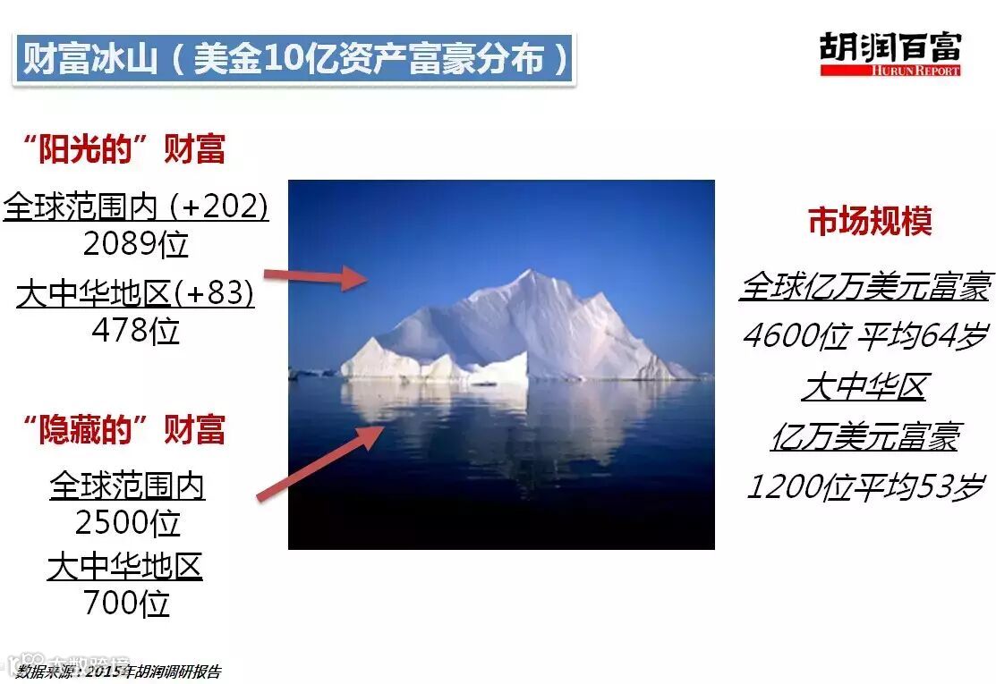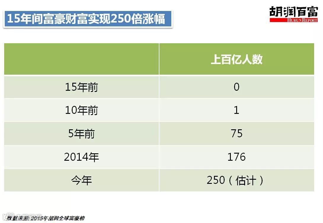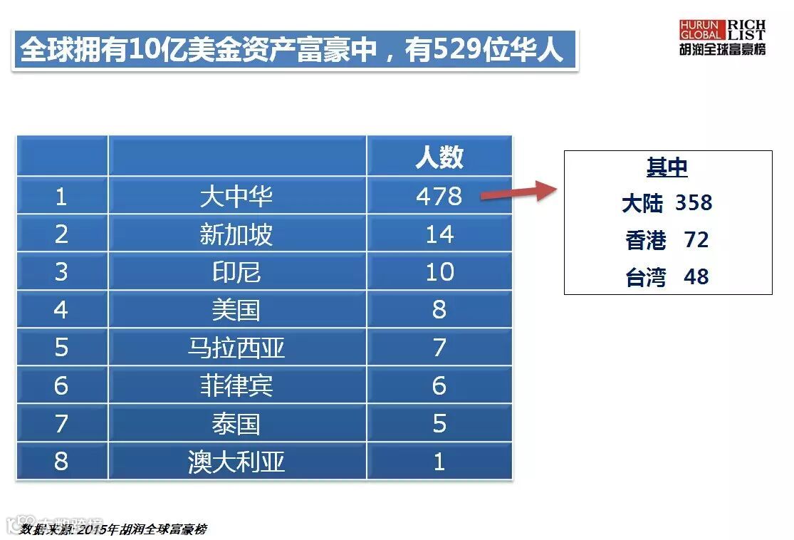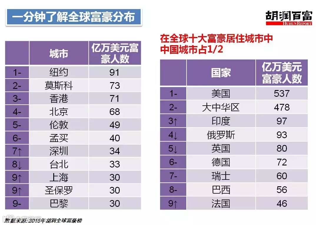 根据2015年胡润百富统计得出的全球高净值人群财富构成及分布趋势数据显示。全球亿万美元富豪共有4600位,平均64岁,大中华地区的亿万美元富豪为1200位,平均53岁。在全球富豪榜单中,位列前三位的为比尔·盖茨,卡洛斯·斯利姆和沃伦·巴菲特;2015年中国富豪领军人物则是王健林、马云和李河君。