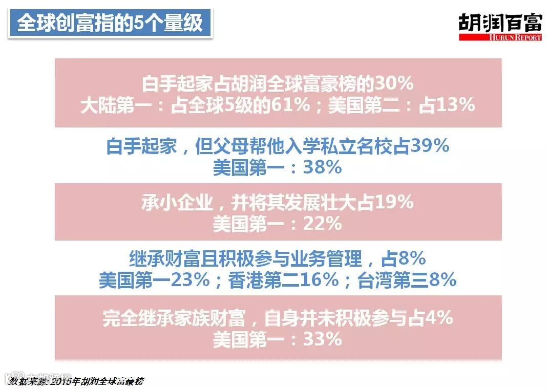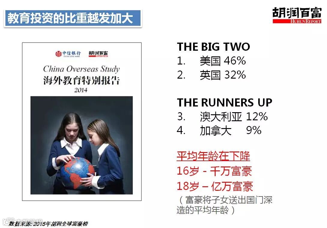 胡润认为:“在中国人的创富梦想愈显活力的今天,我们要让财富实现转型,注重更多非物质的表达,例如创富梦想、教育、健康。企业财富的传承,教育是尤为重要的一环。”同时,私立学校、出国留学将会成为中国富豪教育子女的首要选择。