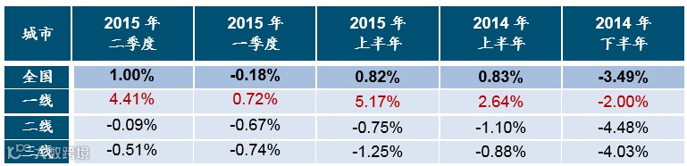 2015年上半年,在宽松政策影响下,楼市回暖迹象明显,百城住宅均价由跌转涨。分城市来看,上半年各线城市住宅价格表现分化,一线城市累计上涨5.17%,上涨态势明显,二三线城市均下跌。