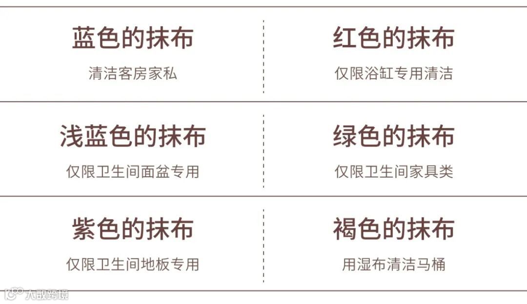 6块不同颜色的清洁工作布,有序地摆放于清洁车上,旁边贴好颜色与用途,按客房不同区域、不同用具、不同部位区分使用。