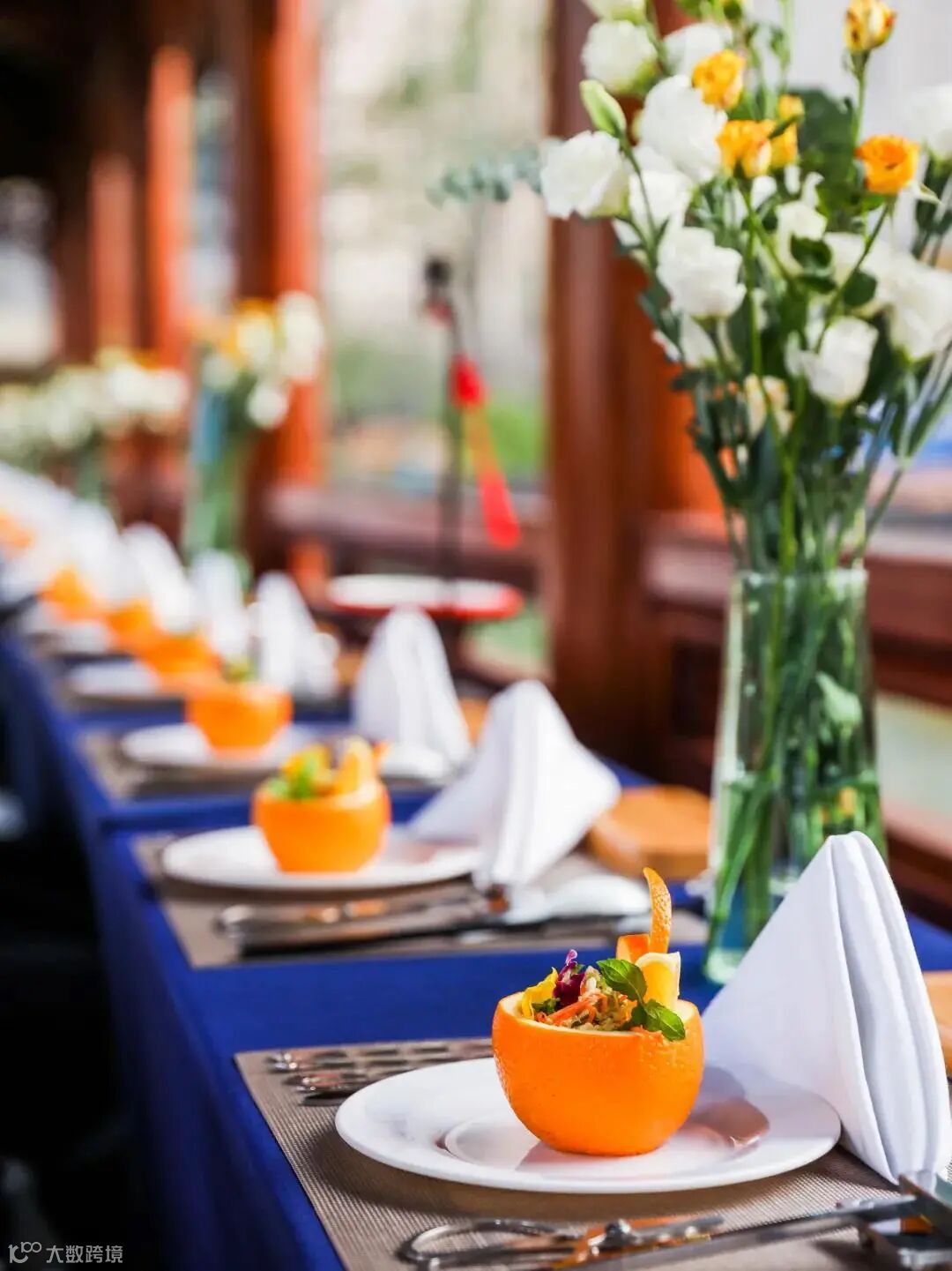 在日落的霞光中,精致的桌摆与设计,餐具的井然有序,星厨团队的专业认真,每一个细节都做到极致,充满仪式感的现场布置,尽显城市岛居“星”式生活。