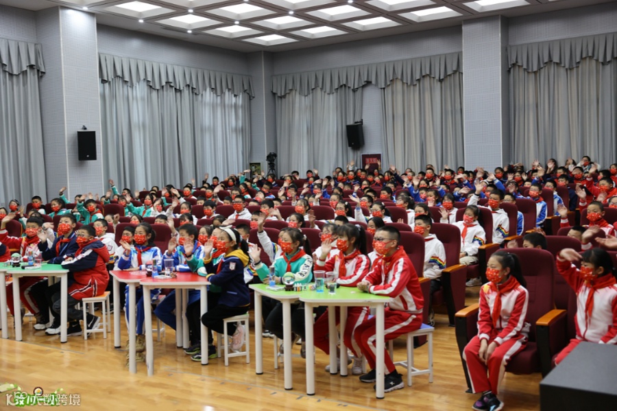 在热烈的气氛中,孩子们直接与航天员通话交流,并在课桌上进行同步实验。