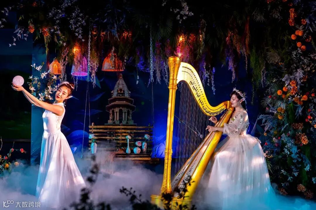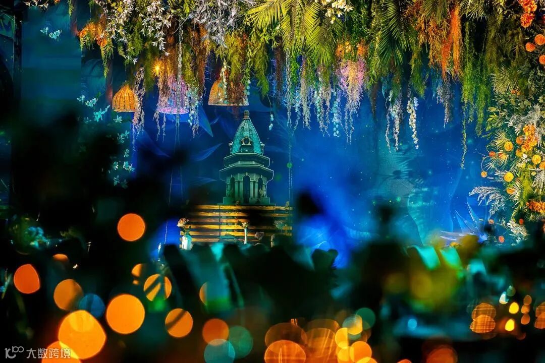 琴声渐起,水雾缥缈,光影交错,在郁郁葱葱、繁花点缀的森林秘境中,宾客们仿佛进入了爱丽丝仙境,沉浸于奇幻丛林景致之中。