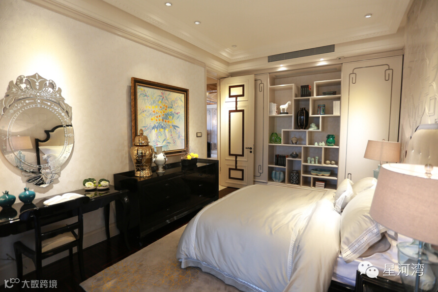 从入户门到家具、内饰,经典版中繁复的肌理和线条在这里变得通透疏朗。比如入户门厅整片的大理石拼花、三层豪华吊灯是经典版星河湾产品的标配,在这里均已化繁为简;主卧背景墙以皮革或木质材料,加以现代工艺和流线,将生活场景从古典拉回到现代。