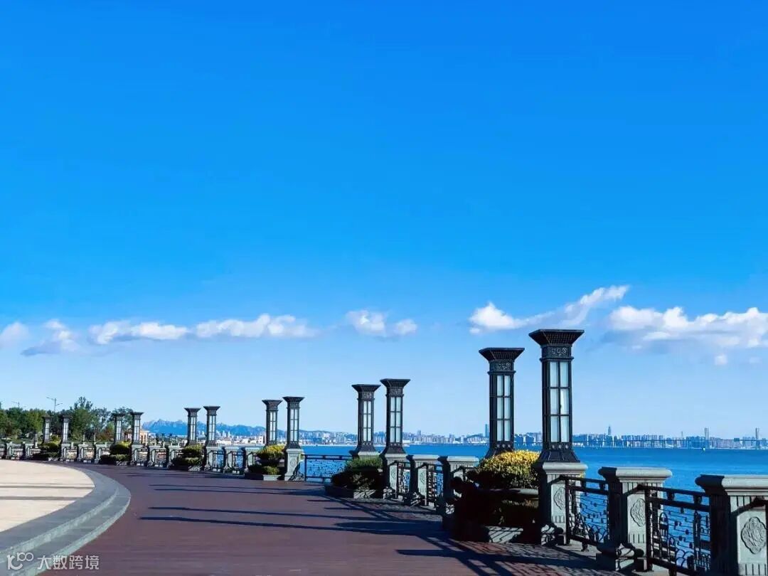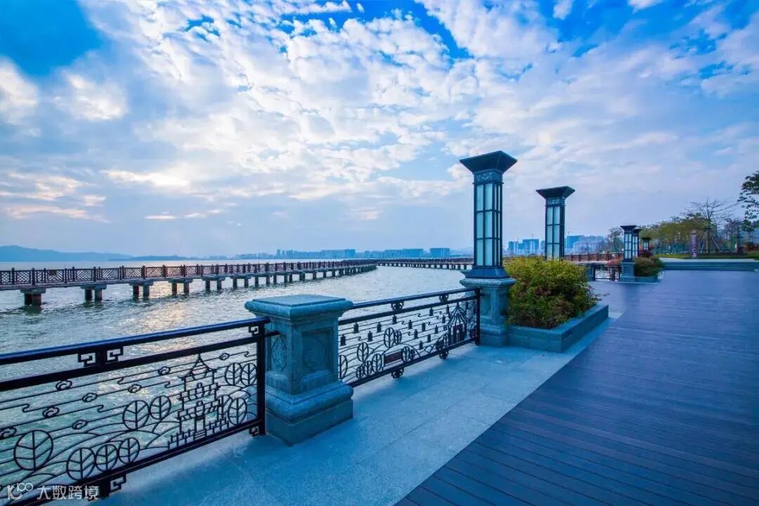 海滨木栈道上,品清湖波光如画,心情也随之舒展。