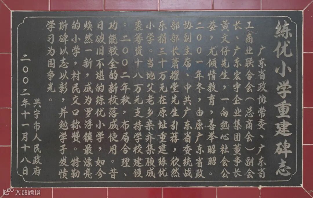 粤东兴宁市罗浮镇练优小学校门口,有块《练优小学重建碑志》,铭刻了2001年星河湾集团董事长黄文仔先生捐资重建的历史。20年来,星河湾对练优小学的帮扶从未间断。