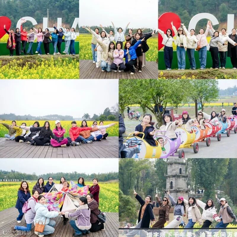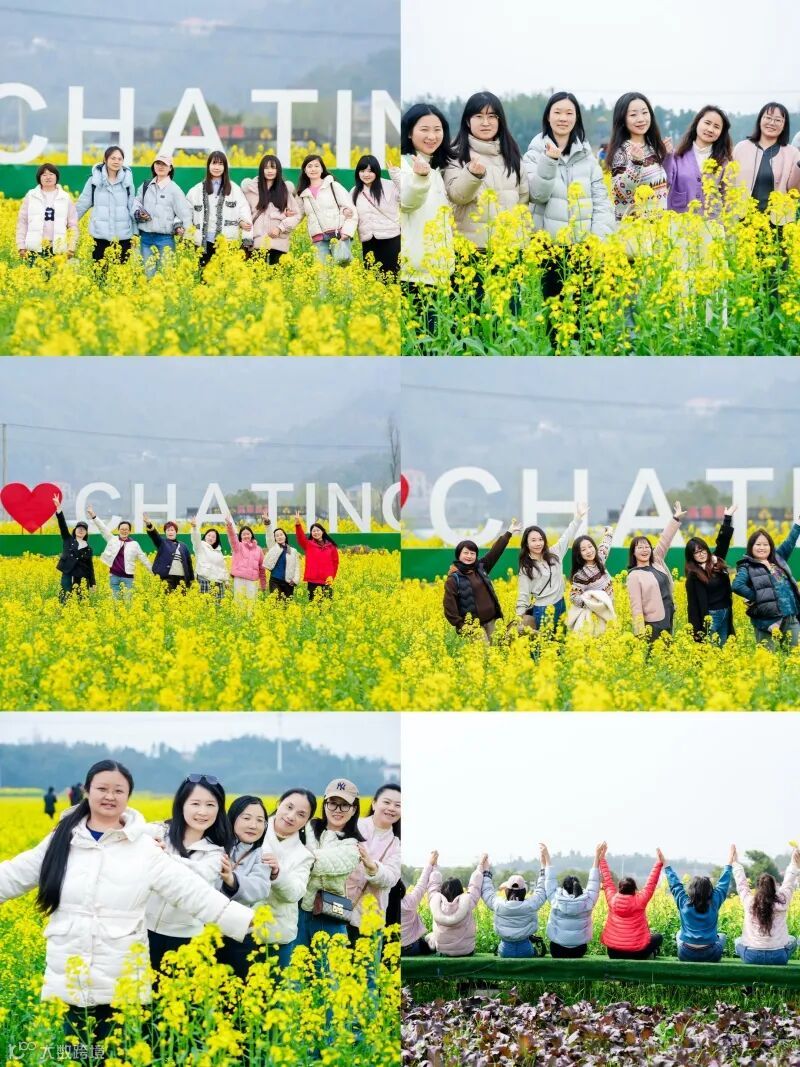 茶亭镇万亩油菜花海正值盛花期,金黄花田层层叠叠、绵延连片,与青山、村落、古惜字塔相映成趣,勾勒出一幅诗意盎然的春日田园画卷。漫步在花间步道上,和煦春风拂面,淡淡花香沁人心脾,女职工们三五成群结伴而行,赏花海、拍美照、话家常,欢声笑语洒满整片花田。大家纷纷驻足打卡留念,用镜头定格灿烂笑容与美好瞬间,在自然美景中卸下工作的疲惫,尽情享受春日的惬意与节日的温馨。