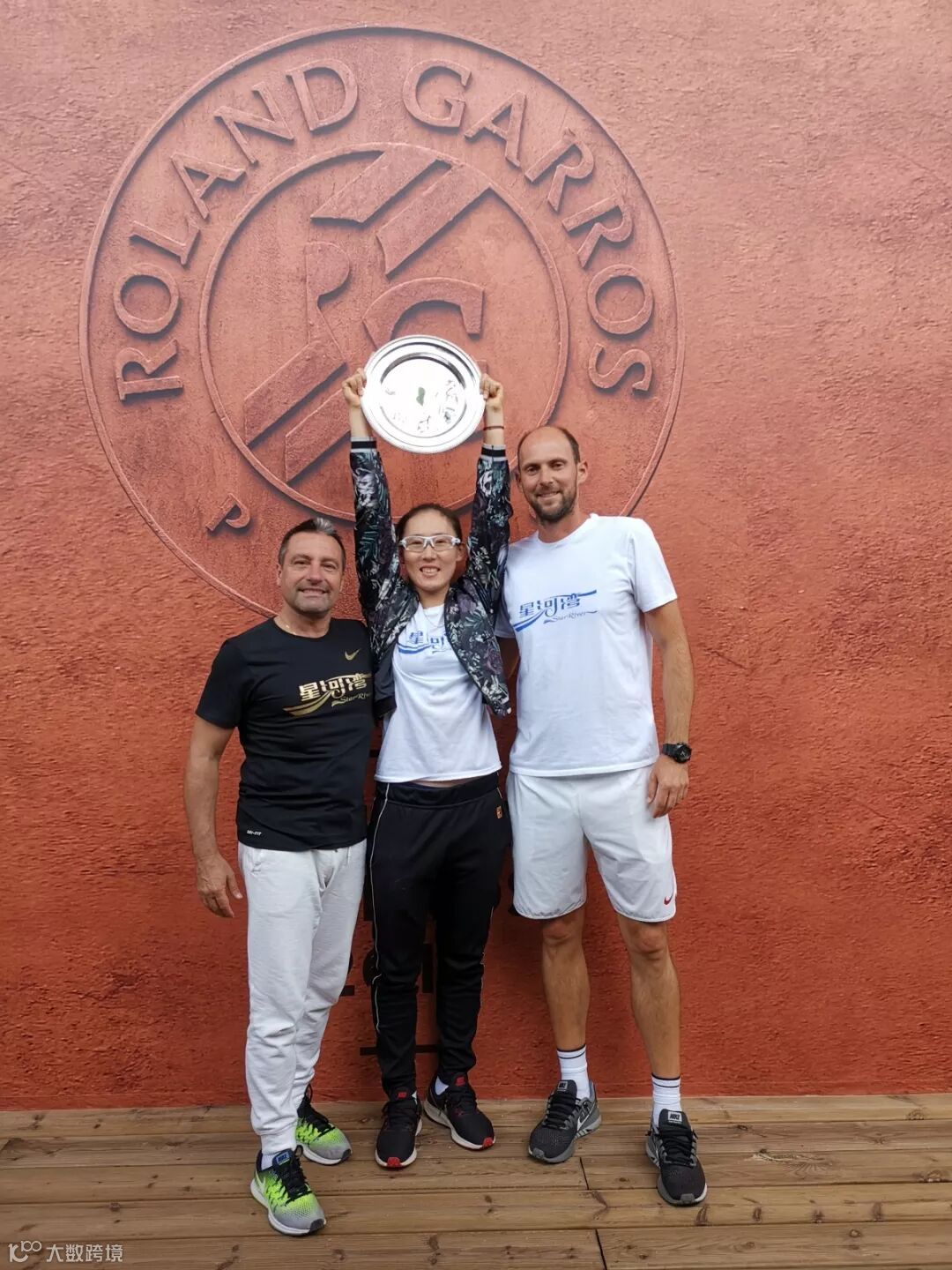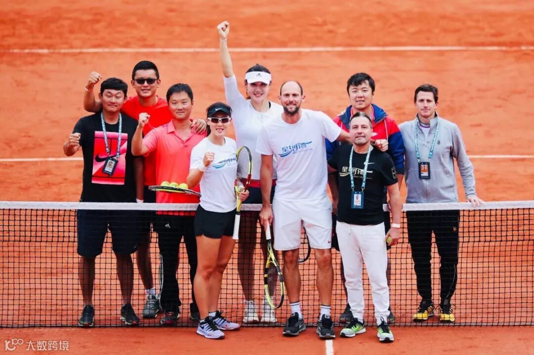 ▲郑赛赛在星河湾职业网球俱乐部的主带教练Goran Tosic(前排左一)、星河湾职业网球俱乐部体能师Carlo Bilardo(前排左二)