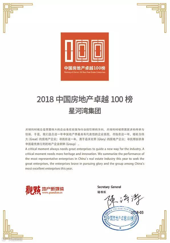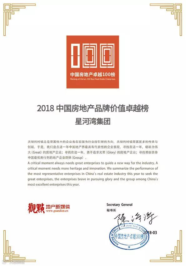 ▲ 星河湾荣获“2018中国房地产卓越100榜”证书