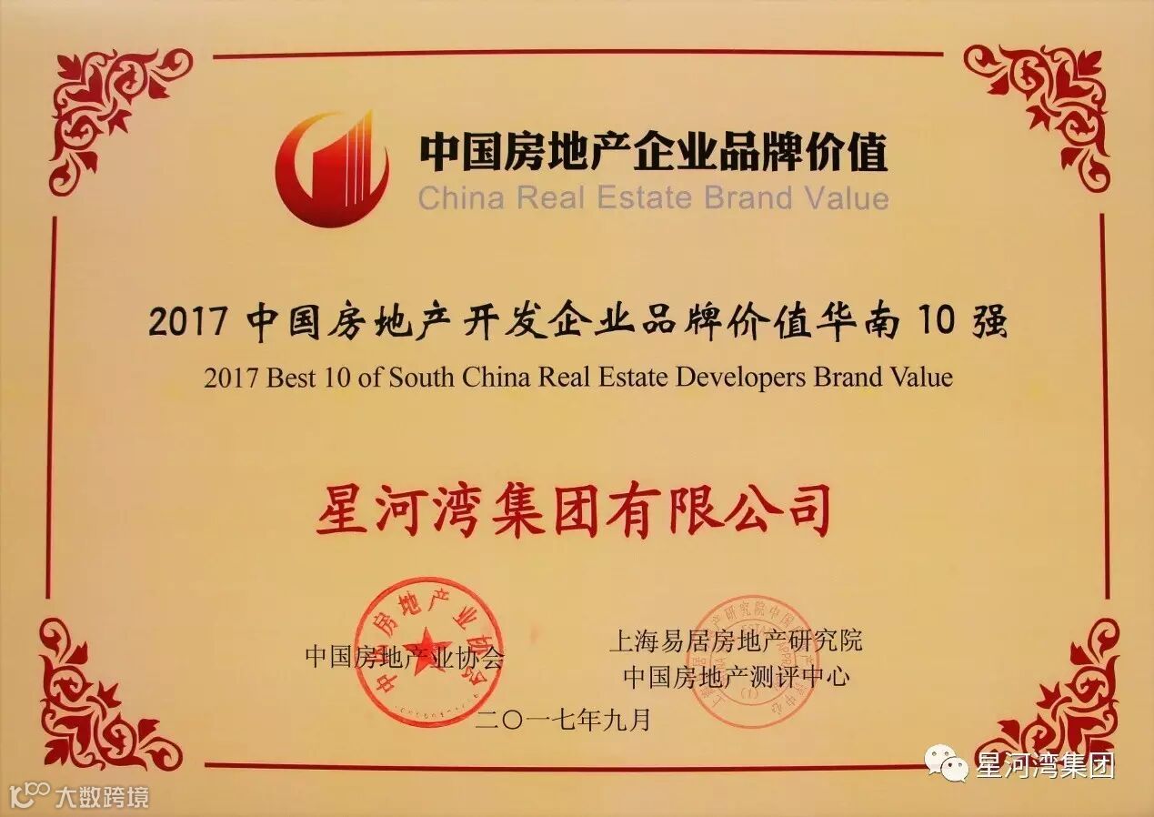 在9月13日举办的"2017中国房地产企业品牌价值测评成果发布会暨房地产品牌价值高峰论坛"上,星河湾入榜“2017中国房地产开发企业品牌价值华南10强”以及“2017中国物业管理企业综合实力100强”。