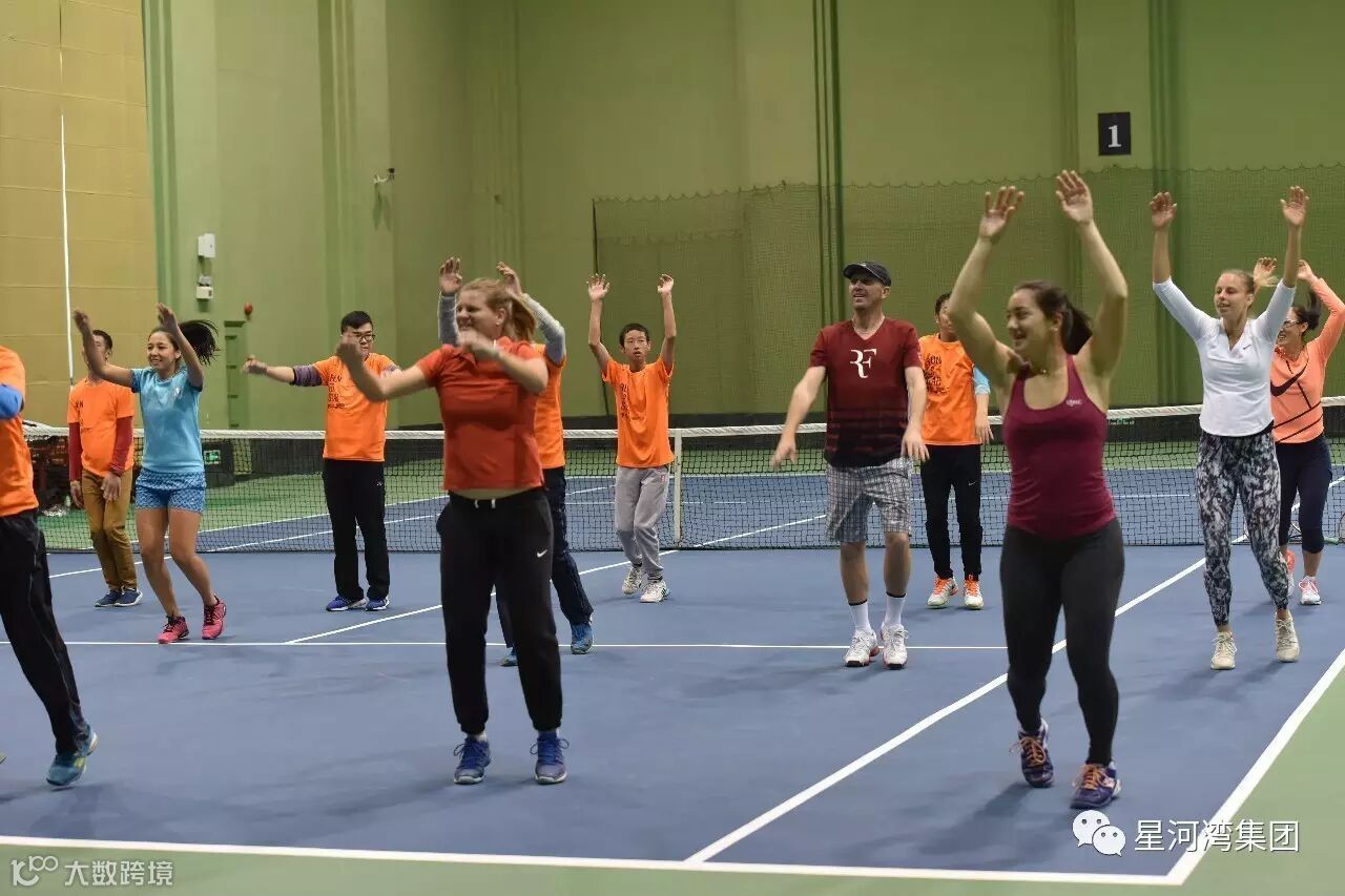 星河湾职业网球俱乐部的知名教练和明星球员与网球爱好者一起热身。