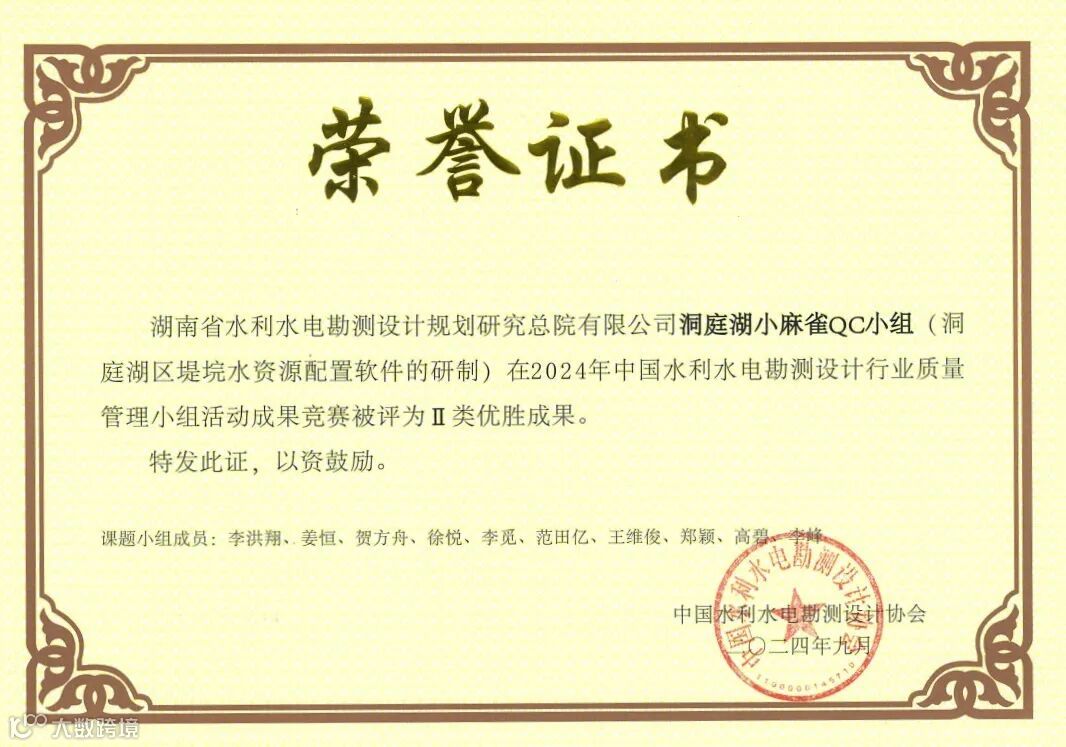 湖南省水电设计院推荐申报的“洞庭湖区堤垸水资源配置软件的研制”“提高洞庭湖水沙数学模型数据前处理效率”等成果分别获Ⅱ类优胜成果5项、Ⅲ类优胜成果3项。