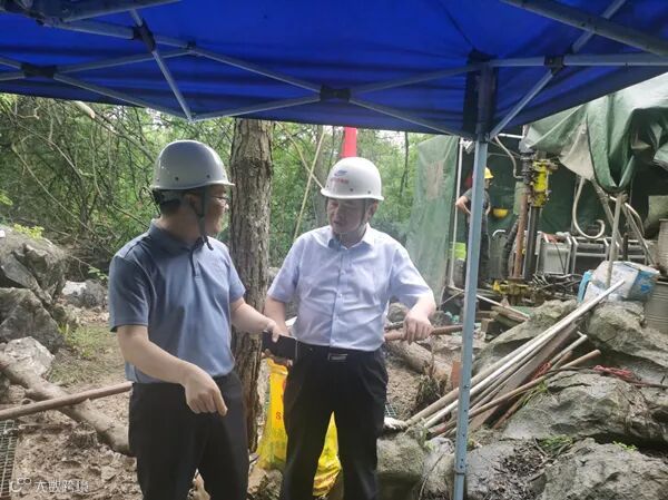 在6#洞地表补勘现场,董必胜查看了钻孔岩芯及钻探现场,详细询问了工程进度与