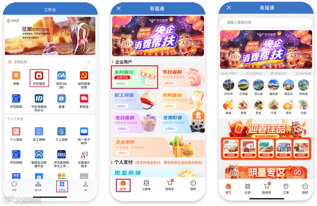 点击“工作台-中交福享-乡村振兴”,进入迎春活动专区,使用积分或现金支付。