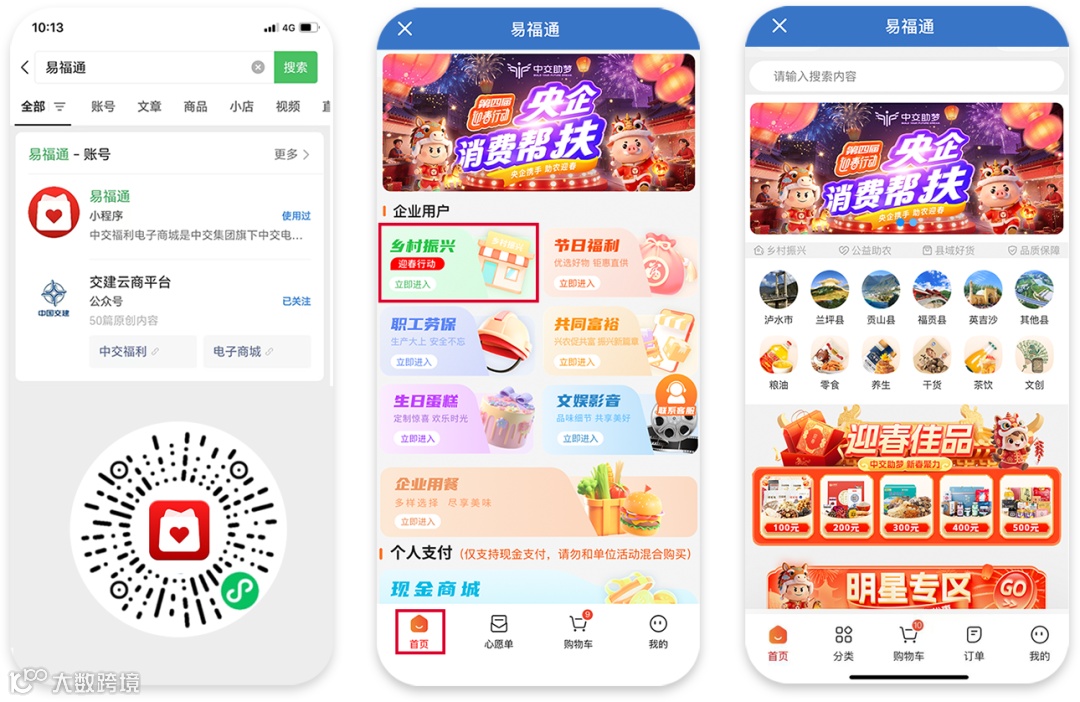 微信搜索“易福通”小程序,点击首页“乡村振兴”进入迎春活动专区,使用积分或现金支付。