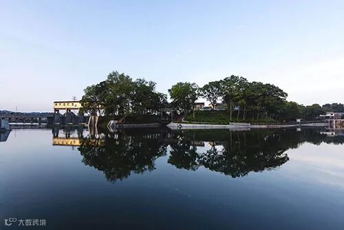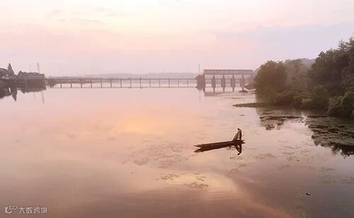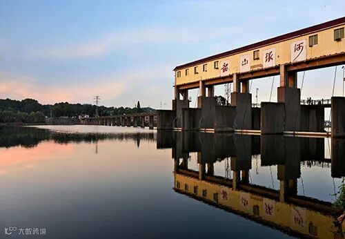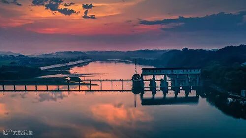 清晨,金灿灿红彤彤的朝霞映在洋潭坝上,洒在涟水河上,妙不可言,坝上便桥和启闭机醉美剪影,远处的隐隐可见的山峦,桥上行色匆匆几位行人,意义深远的"韶山银河″题词,汇成一首优美动人的晨曦交响曲……