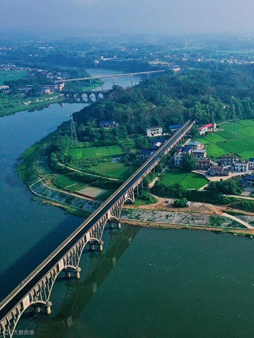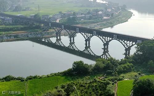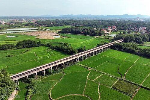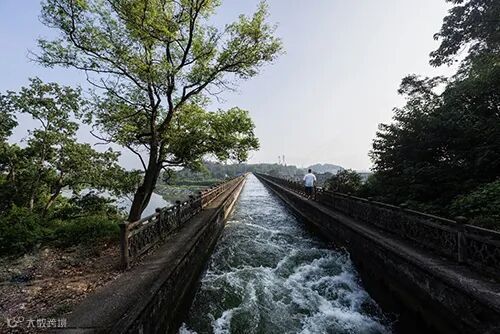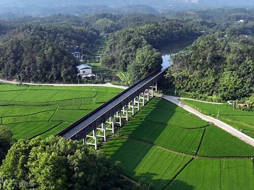 韶山灌区的一条渡槽,宛如一道飞越于山峦间的长虹,渡内水湍急,水声潺潺。大片的稻田,禾苗长势良好,又是一个丰收年。