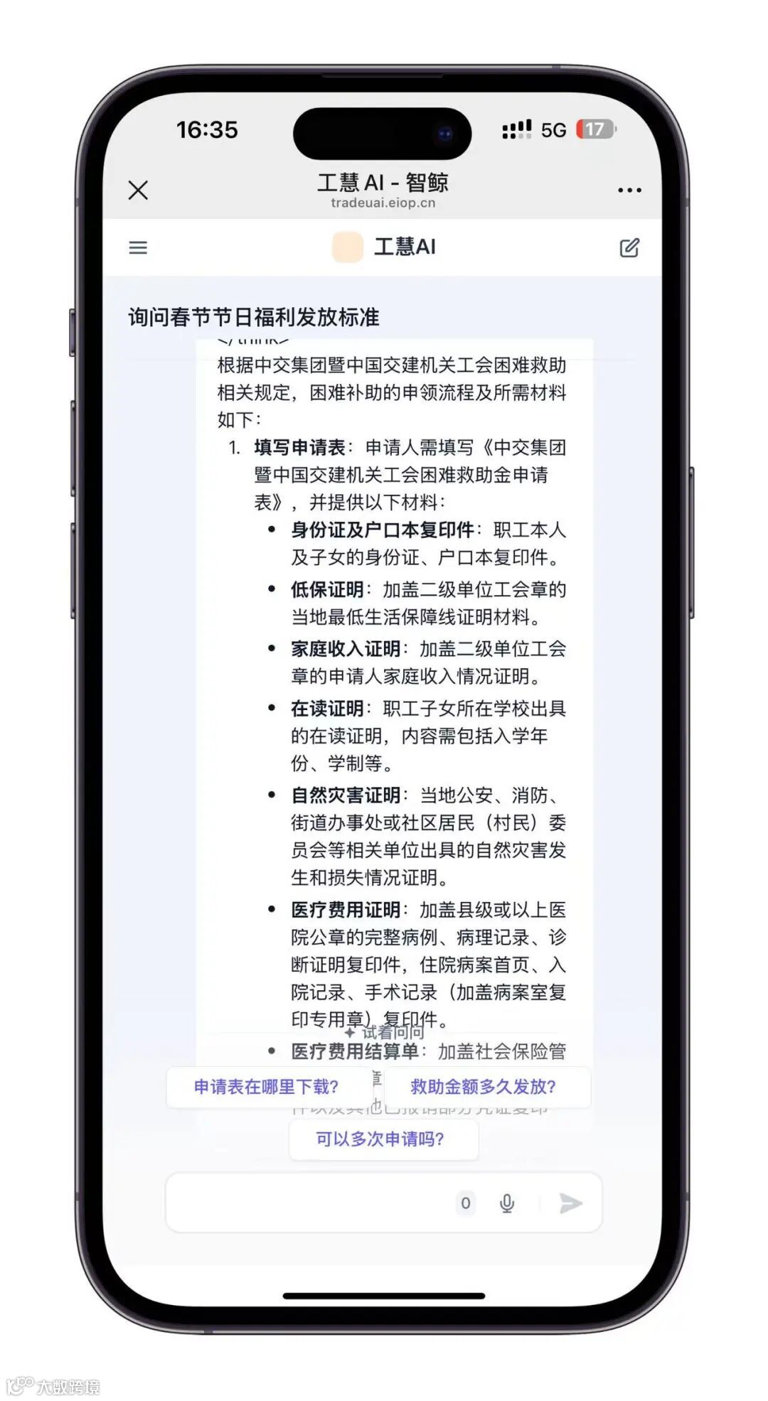 “工慧AI”之所以如此强大,得益于工会联合会办公室和信科集团一同构建的工会垂直领域知识库,以及运用“大语言模型(LLM)+检索增强生成(RAG)”技术,“工慧AI”能够精准解析职工咨询需求,动态调用工会政策、中交集团相关制度文件,显著提升在工会垂直场景的问答准确率,大家快来试试吧!