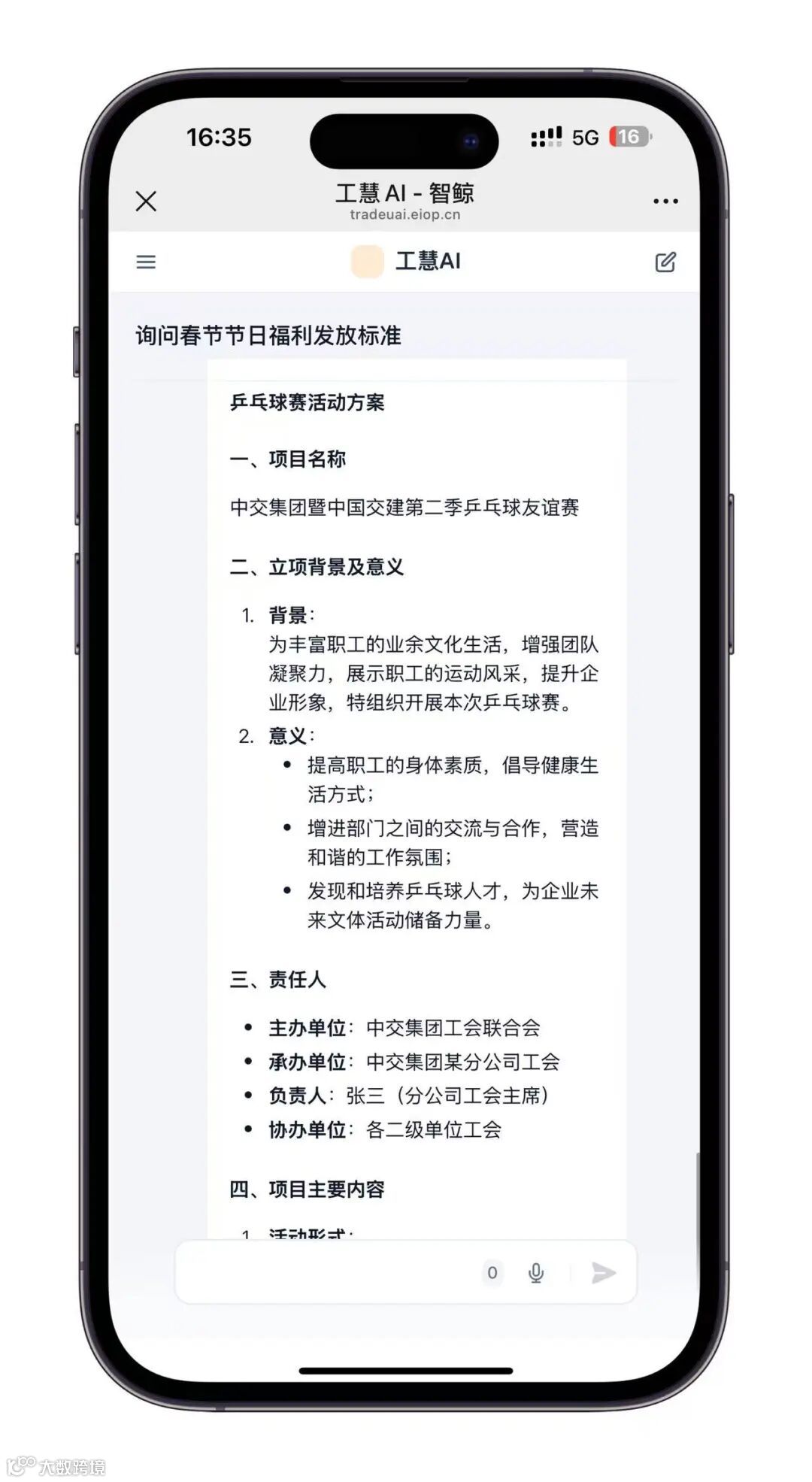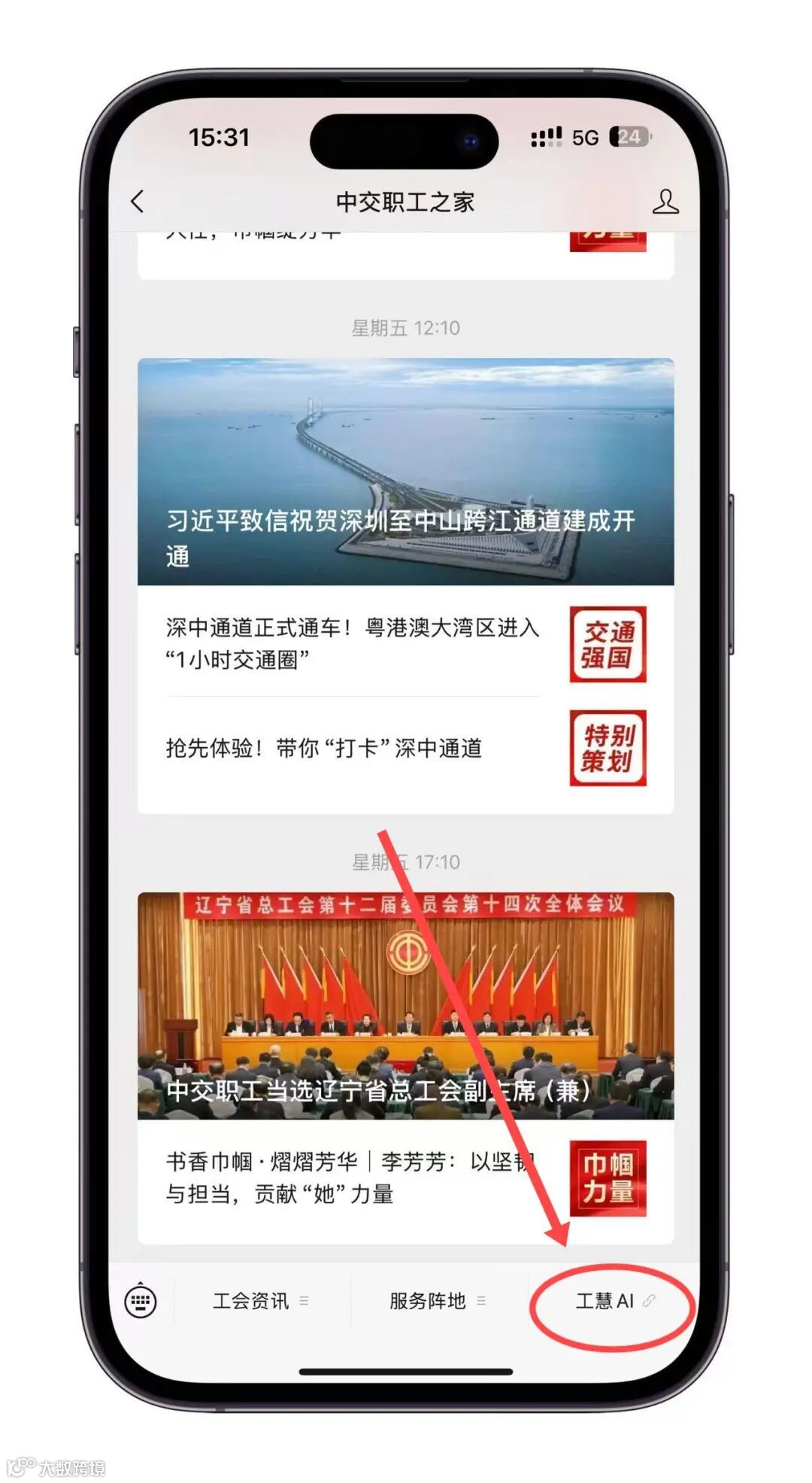 好消息!中交集团工会联合会深入贯彻中交集团“蓝翼”大模型发布会暨“AI+”专项行动推进会精神,积极推进“AI+”专项行动,提高工会工作数字化水平,通过“中交职工之家”微信公众号接入DeepSeek大模型,打造了职工专属的“工慧AI”,现在正式上线啦!