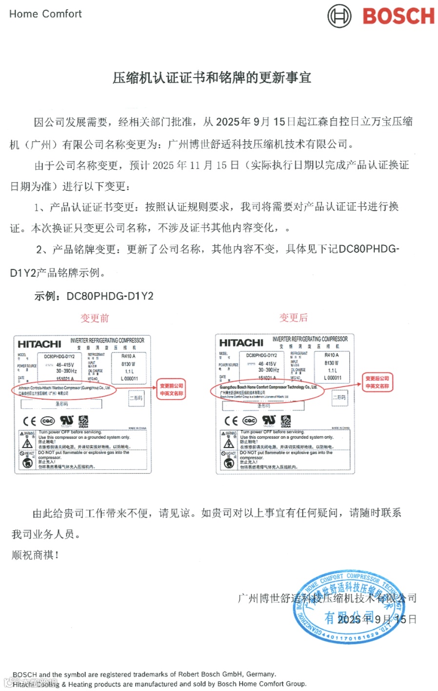日立压缩机变更函 北京嘉兴裕隆