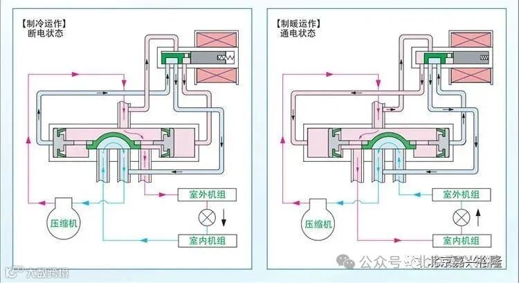 根据四通阀结构不难发现,当主滑阀处于中间位置状态时,如下图所示,E、S、C三条接管互相串通,有一定的中间流量,此时,压缩机高压管内的冷媒可以直接流回低压管。设计中间流量的目的是当主滑阀处在中间位置时,能起到卸压的作用,避免空调系统受高压破坏。