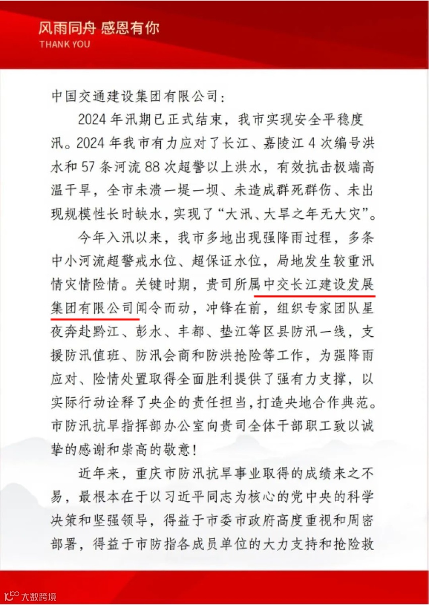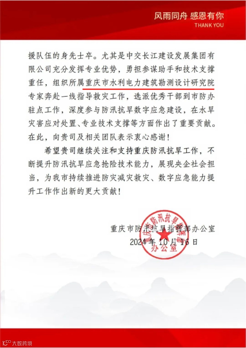信中,重庆市防汛抗旱指挥部办公室对公司支持重庆防汛抗旱工作表示衷心感谢。信中指出,中交长江建设发展集团有限公司充分发挥专业优势,勇担参谋助手和技术支撑重任,组织所属重庆市水利电力建筑勘测设计研究院专家奔赴一线指导救灾工作,选派优秀干部到市防办驻点工作,深度参与防汛抗旱数字应急建设,在水旱灾害应对处置、专业技术支撑等方面作出了重要贡献,充分展现了央企社会担当。