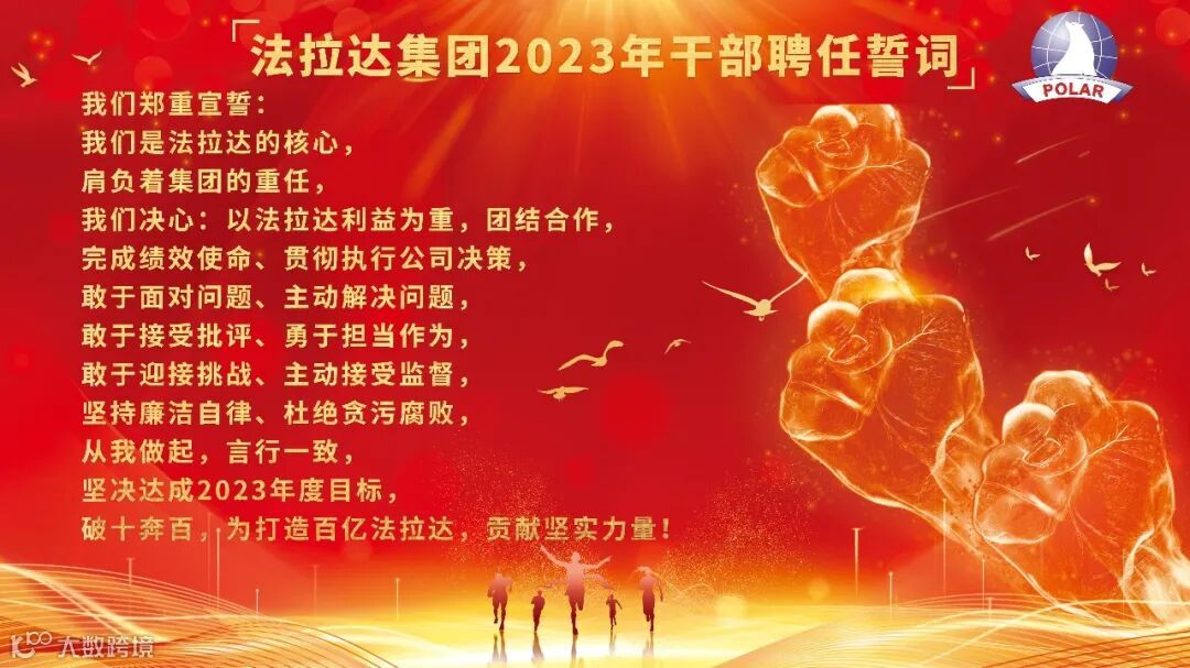 击鼓催征再出发,“卯”足干劲启新程,2023年2月法拉达集团广州事业部、销售公司、新能源事业部、与天津事业部对管理干部举行了隆重的授聘仪式。全体管理干部将拿出“起步即冲刺、开局就决战”的状态,开足马力,快马加鞭往前赶,全力以赴确决胜2023!