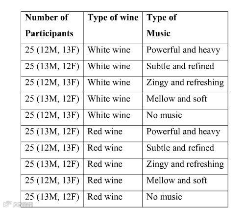 样本容量为250名成年人。这250人分别进入5间品酒室,4间播放不同风格的音乐,1间是没有任何声音。之后他又让这些人对随机放置的一杯红葡萄酒或一杯白葡萄酒进行评鉴。