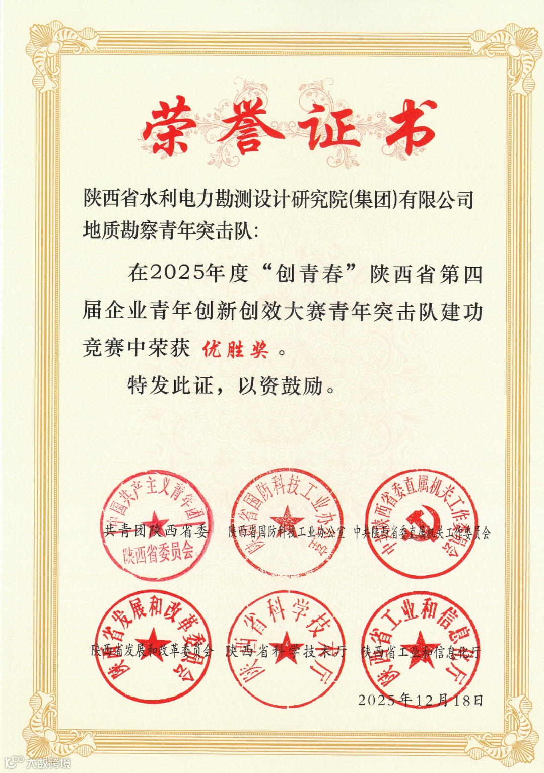 近日,由团省委、省国防科工办、省委直属机关工委、省发改委等八部门联合举办的“创青春”陕西省第四届企业青年创新创效大赛落下帷幕,设计集团团委组织申报的地质勘察青年突击队凭借扎实的专业能力、突出的创新成果及顽强的拼搏精神,荣获大赛“优胜奖”,充分展现了新时代水利青年在岗位建功、创新创效中的责任与担当。