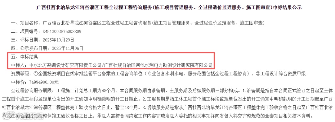 2025年11月6日,广西壮族自治区河池水利电力勘测设计研究院有限公司(以下简称“我司”)与中水北方勘测设计研究有限责任公司携手同行、精诚合作,在广西桂西北治旱龙江河谷灌区工程全过程工程咨询服务项目的公开招标中,凭借前瞻性的规划理念,创新的技术解决方案与完善的实施保障体系,成功中标,实现了合作共赢。