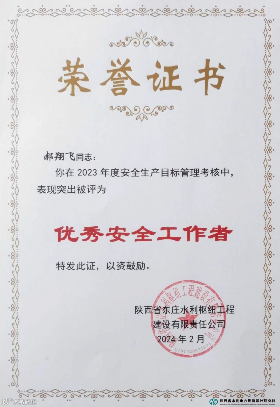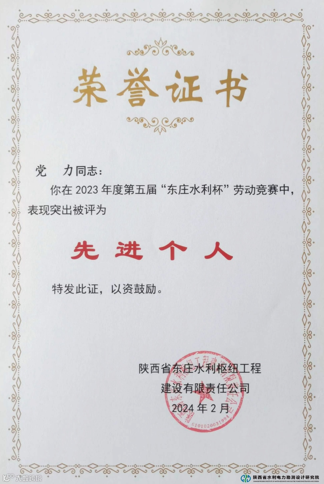 2月28日,陕西省东庄水利枢纽工程建设有限责任公司召开2024年度工作会,陕西省水电设计院荣获2023年度第五届“东庄水利杯”劳动竞赛“先进集体”荣誉称号,两名同志分别荣获“先进个人”和“优秀安全工作者”荣誉称号。