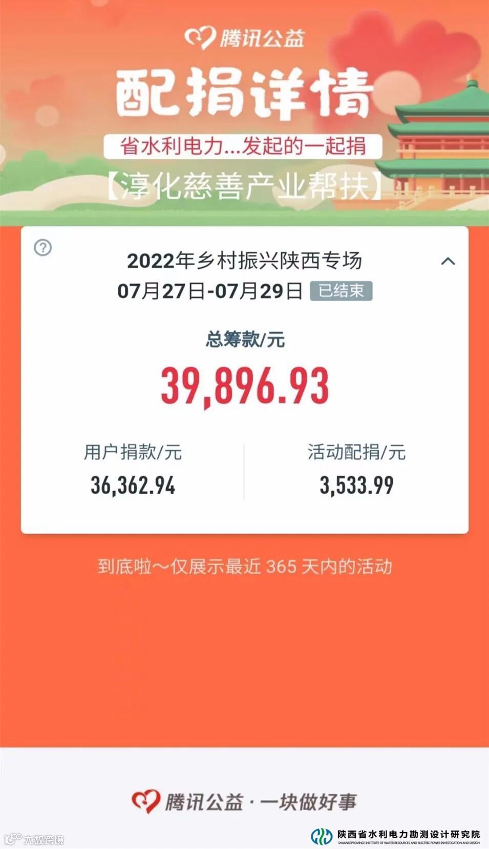 近日,省水电设计院积极响应省慈善协会举办的“乡村振兴·陕西专场”公益捐赠活动,为“淳化慈善产业帮扶”项目共募集善款39896.93元,位列水利厅帮扶单位第一。