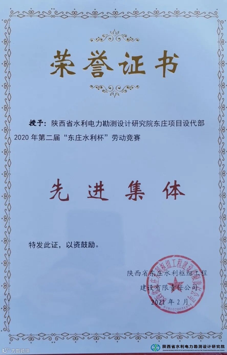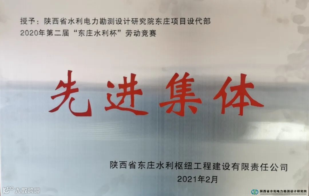 2月6日,省水电设计院被陕西省东庄水利枢纽工程建设有限责任公司授予2020年第二届“东庄水利杯”劳动竞赛“先进集体”荣誉称号。