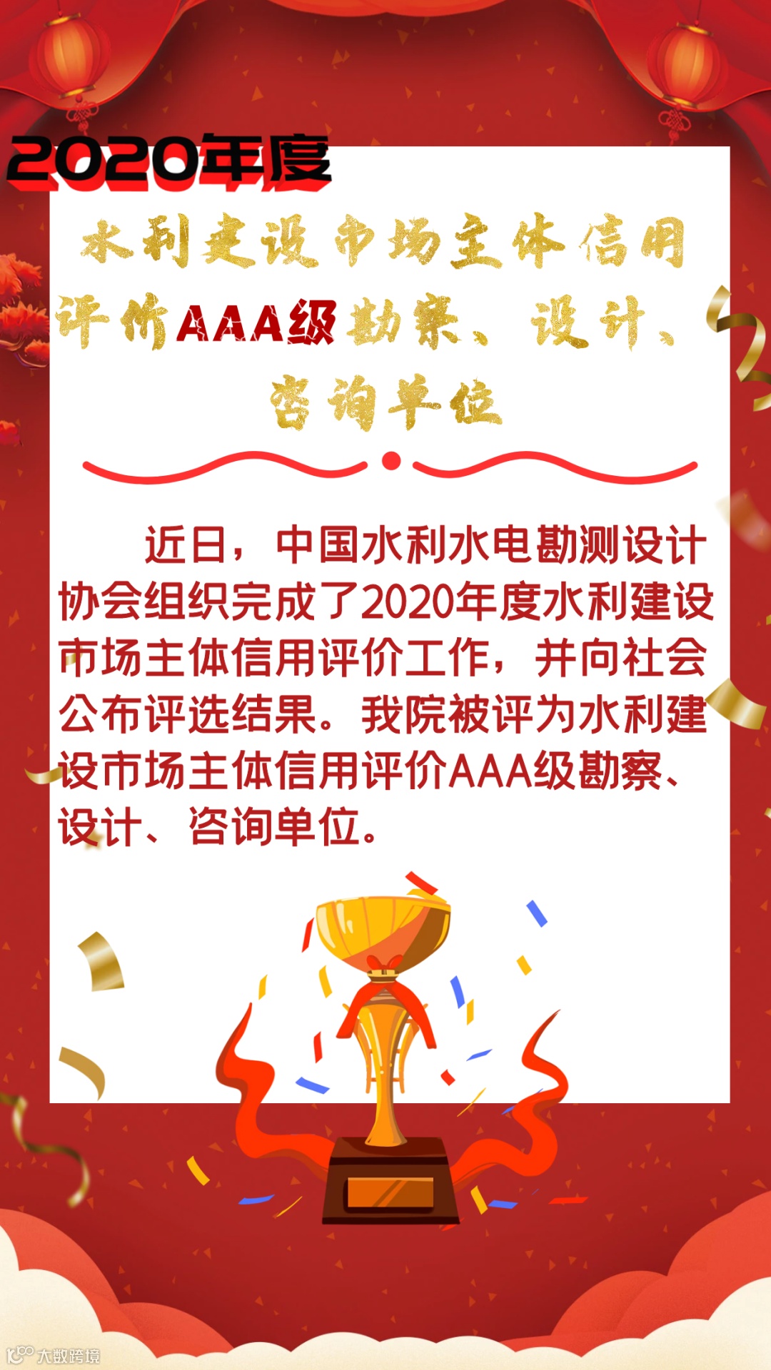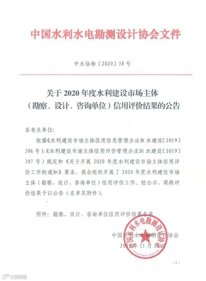 近年来,我院凭借规范的市场行为、良好的市场诚信度、较强的行业综合实力,赢得了中国水利水电勘测设计协会评审委员的一致认可,获得了勘察、设计、咨询信用评价最高等级AAA级。2020年是我院全面实施内部机构改革、转型发展的开局之年,我院将始终秉承诚实守信的经营理念,以更加扎实的技术、专业的态度,持续树立良好的行业形象,为社会各界提供全方位、高质量的服务。