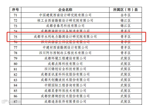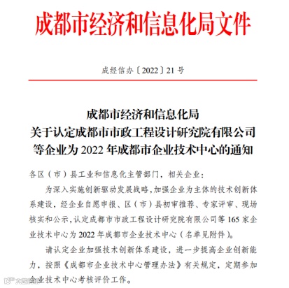 2022年11月15日,成都市经济和信息化局发布公告,成都市水利电力勘测设计研究院有限公司(以下简称“成都市水利院”)企业技术中心被认定为2022 年成都市企业技术中心。