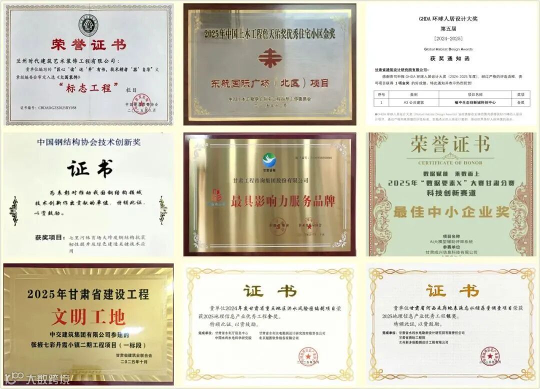 研发的3项应用技术获甘肃省技术发明一等奖、科技进步三等奖及陕西省科技进步二等奖,在甘肃省企业科技创新大赛中获多项成果奖与企业奖。依托自主研发的AI大模型辅助评审系统获“数据要素X”大赛最佳中小企业奖,获评“西部企业数字化建设成效卓越单位”。4个监理项目获评“建设工程文明工地”,3个项目通过绿色建造与智慧工地水平评价。在甘肃省百万职工技能竞赛住宅设计大赛中获优秀组织奖及4项个人荣誉。在甘肃省第八届BIM技术应用大赛中揽获15个奖项。