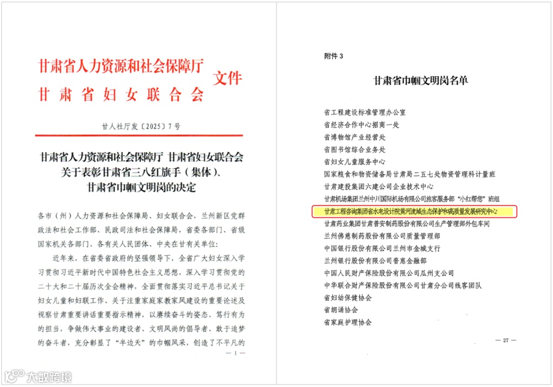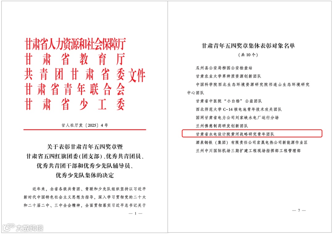 2025年10月21日,省人社厅、省教育厅、团省委等5家单位联合印发《关于表彰甘肃省青年五四奖章暨甘肃省五四红旗团委(团支部)、优秀共青团员、优秀共青团干部和优秀少先队辅导员、优秀少先队集体的决定》,黄河研究中心申报的“甘肃省水电设计院黄河战略研究青年团队”荣获“甘肃青年五四奖章”荣誉称号,是全省10个荣誉集体之一。12月26日,省人力资源和社会保障厅、甘肃省妇女联合会印发《关于表彰甘肃省三八红旗手(集体)、甘肃省巾帼文明岗的决定》,黄河研究中心团队荣获“甘肃省巾帼文明岗”称号。