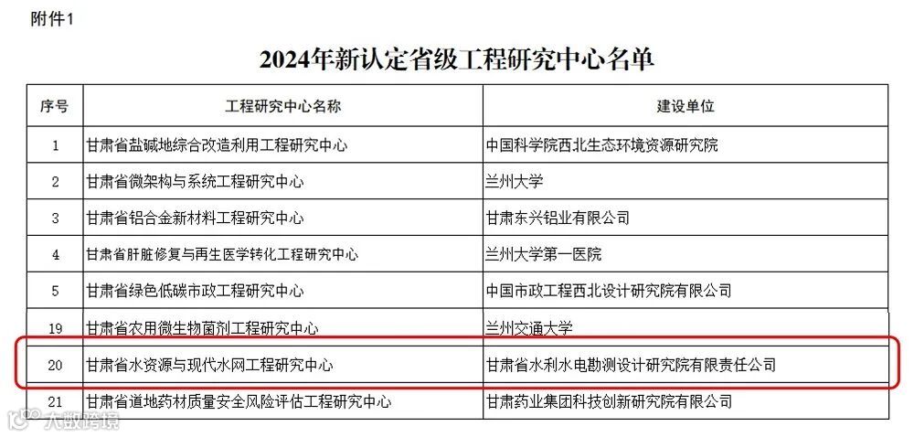近日,甘肃省发展和改革委员会公示了2024年甘肃省工程研究中心拟认定及优化整合名单,甘肃省水电设计院申报的“甘肃省水资源与现代水网”省级工程研究中心获批立项建设。这是公司获批的第一个省级工程研究中心,也是全省水资源及水工程领域唯一一家省级工程研究中心,标志着公司在水利工程科研平台建设方面取得了重大突破。