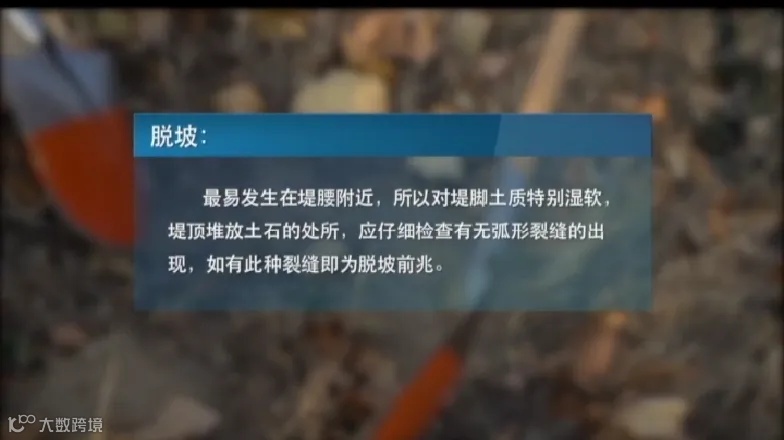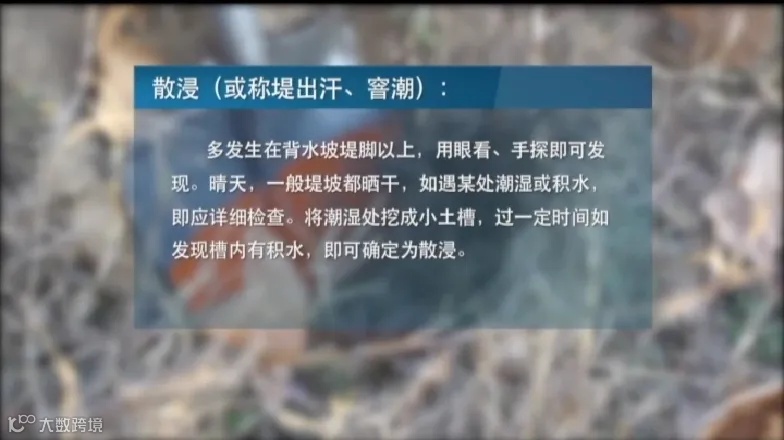 ②看堤防迎水坡有无浪坎、崩塌,近堤水面有无漩涡;