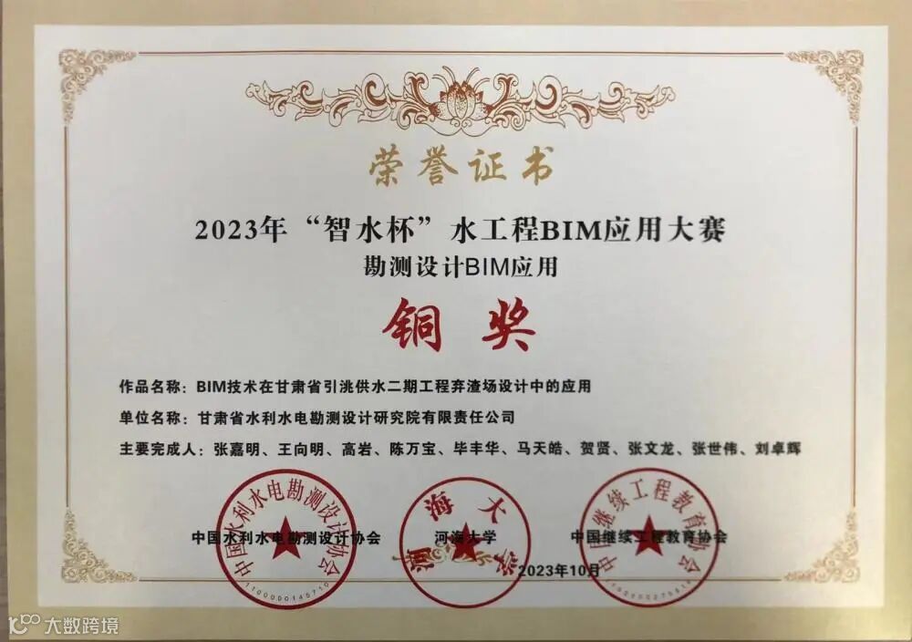 近日,中国水利水电勘测设计协会发布了2023年“智水杯”水工程BIM应用大赛获奖项目公示,甘肃省水电设计院申报的《BIM技术在甘肃省引洮供水二期工程弃渣场设计中的应用》获得勘测设计BIM应用铜奖。