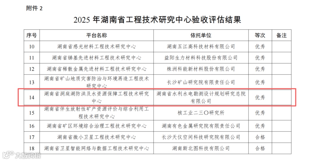 近日,湖南省科学技术厅公布2025年度省重点实验室、工程技术研究中心验收评估结果,湖南省水电设计院“洞庭湖防洪及水资源保障工程研究中心”(以下简称“中心”)凭借优异的建设成效,获评“优秀”等级。